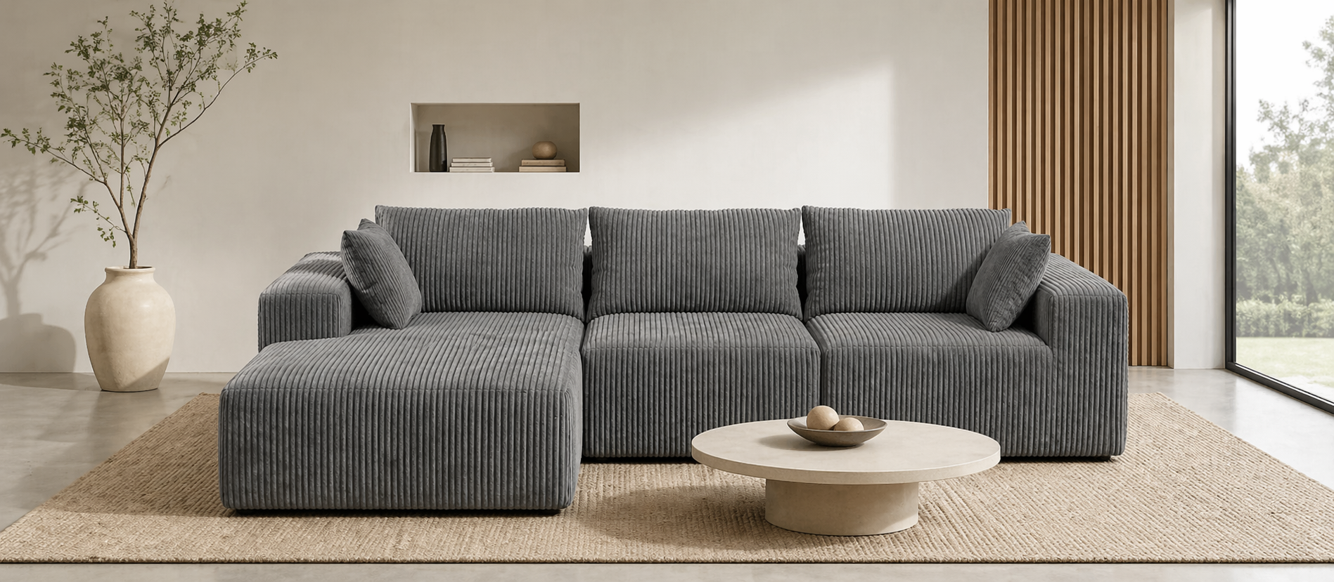 Modernes L-förmiges Ecksofa aus Cord mit tiefem Sitzkomfort und schaumstoffgepolsterter Fläche, montageloses Design in Grau